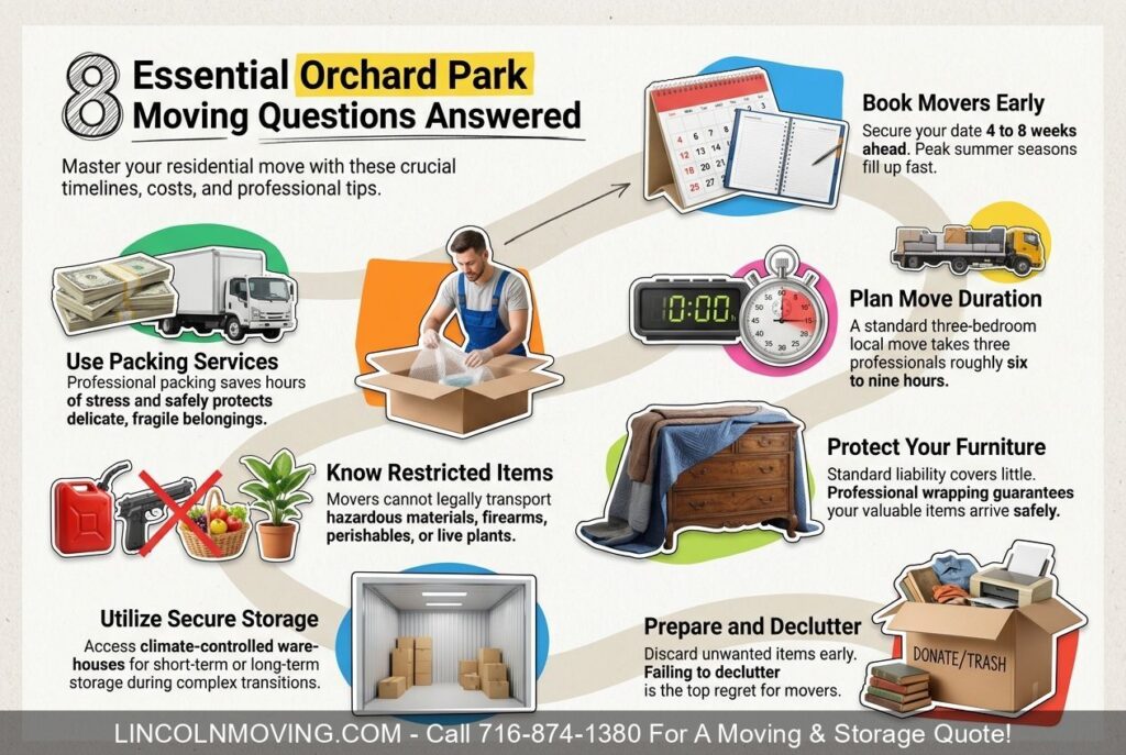 I’m going to walk you through the eight most important questions homeowners ask about hiring Orchard Park NY Residential Movers 2026. You’ll learn about costs, booking timelines, packing help, move duration, what you can’t transport, furniture protection, storage choices, and how to prepare.