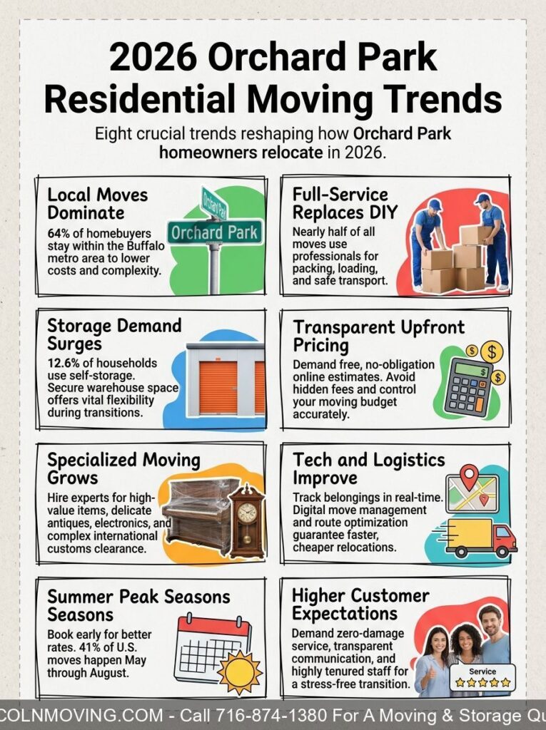 • Local moves dominate Orchard Park’s 2026 residential moving market, with full-service options replacing DIY approaches and storage demand rising significantly.